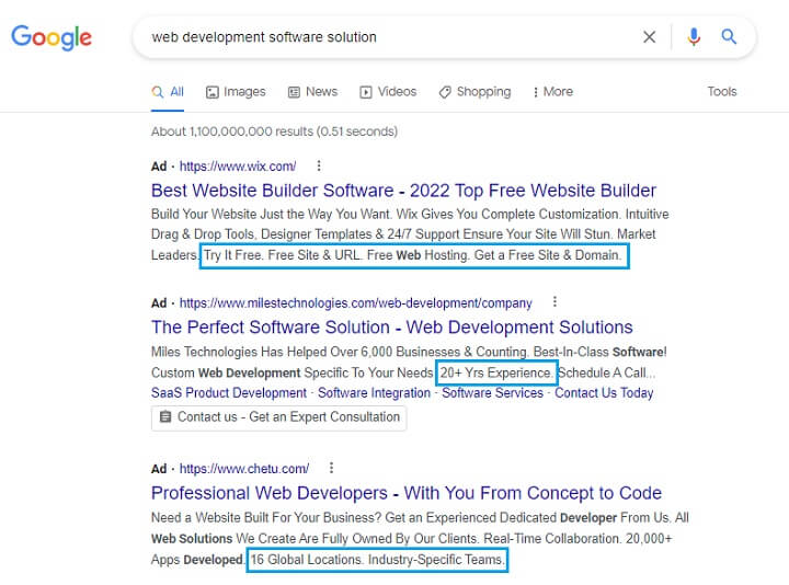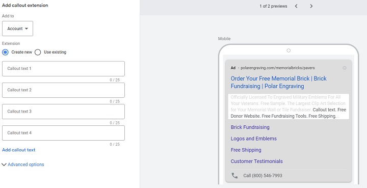 Расширения призывов Google Ads также популярны благодаря своей милой и простой природе. Эти расширения представляют собой короткие фрагменты текста (и я имею в виду короткие – вам разрешено только до 25 символов), которые появляются после описания вашего объявления.