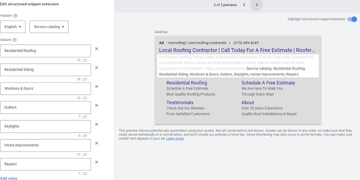 Расширения структурированных сниппетов похожи на расширения призывов, но с другой стороны. Они предоставляют быстрый список или каталог предложений, которые у вас могут быть. Они выглядят аналогично расширениям призывов, поскольку отображаются прямо рядом с текстом описания объявления и не отличаются от него с точки зрения зрителя.