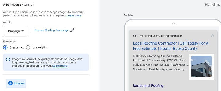 Название этого расширения Google Ads, безусловно, помогает объяснить его назначение: показывать изображение под объявлением. Вы можете загружать квадратные изображения 1×1 размером до 5120 КБ для показа под текстом объявления.
