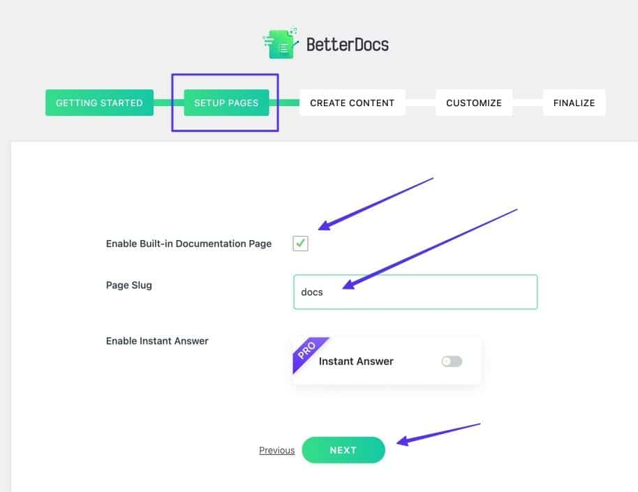 BetterDocs предоставляет замечательное руководство по запуску, позволяющее настроить вашу вики за несколько минут. Пройдитесь по этим шагам, но обязательно остановитесь на вкладке Настройка страниц. Здесь вы установите флажок в поле Включить встроенную страницу документации. Это добавит главную страницу для вашей вики, отдельную от главной страницы вашего сайта. Продолжайте использовать рекомендованный Page Slug или создайте свой собственный. Нажмите кнопку Далее.