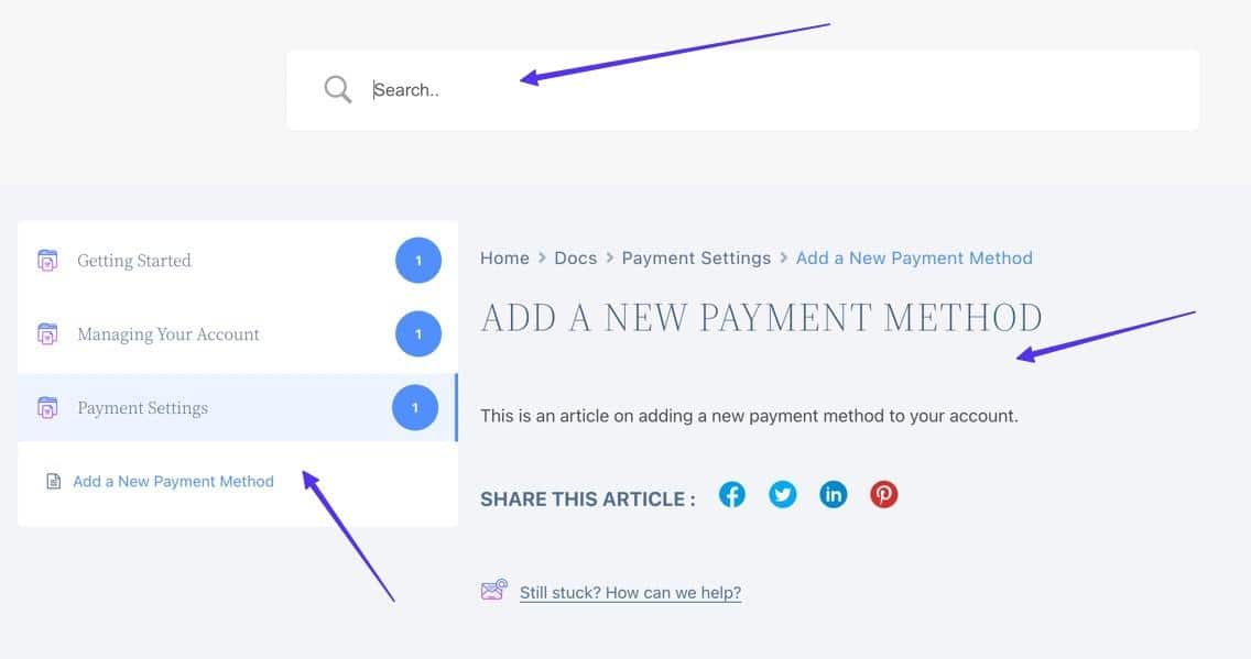 WP Simple Pay – это платежный плагин Stripe для WordPress, и, как и другим компаниям, производящим программное обеспечение и плагины, ему необходимо информировать своих клиентов о том, как пользоваться продуктом. А что может быть проще, чем вики WordPress? В вики WP Simple Pay есть ссылки на иконки, которые ведут к руководствам по началу работы, FAQ, инструкциям по прохождению и управлению аккаунтом. Как только вы переходите на главную страницу, категории отображаются в боковой панели для легкого доступа, а каждая статья предлагает огромное количество медиа-элементов, ссылок, интерактивных кнопок и многого другого.