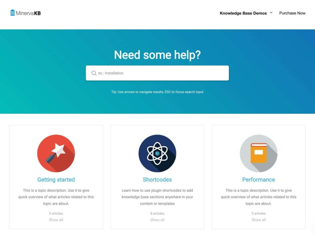 MinervaKB – это плагин премиум-класса с огромным количеством опций для обработки заявок в службу поддержки и обеспечения функциональности живого поиска на существующем сайте. Плагин WordPress wiki/базы знаний поставляется в готовом виде с конструктором шорткодов и настройками обратной связи со статьями. Вы также можете ограничить контент или открыть его для всех желающих.