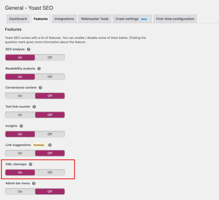 Карта сайта XML ни в коем случае не является обязательной. Но не предоставлять его поисковым системам – это все равно что устно сообщить кому-то сложный маршрут к вашему дому, а не ваш адрес. Поисковым системам будет гораздо проще, если вы укажете им, что должно быть проиндексировано. Таким образом, Google, Bing и другие знают, что из ваших проиндексированных страниц является наиболее важным. Самый большой грех не предоставлять XML sitemap заключается в том, что это чертовски просто сделать. Если у вас уже установлен вышеупомянутый плагин Yoast SEO, просто перейдите в раздел SEO > General > Features и включите функцию XML sitemap: