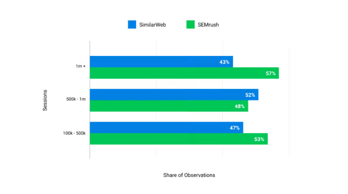 - В целом, Similarweb, похоже, недооценивал количество трафика в большем количестве случаев по сравнению с Semrush.
