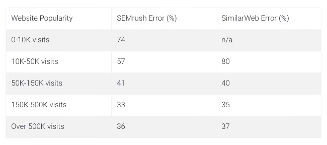 Чем меньше число ошибок, тем выше точность обоих инструментов. В данном случае Semrush также показал более высокие результаты для сайтов в диапазоне меньшего трафика, за исключением сайтов с 50-150 тыс. ежемесячных посетителей. В самой низкой категории трафика Similarweb даже не показал никаких данных.