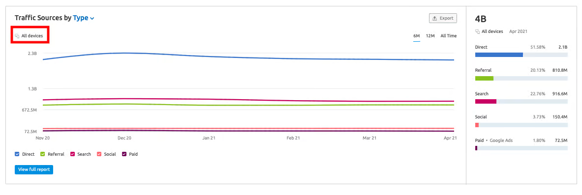 - Каналы трафика: Оба инструмента показывают, откуда поступает трафик ваших конкурентов. Хотя оба они охватывают прямые, поисковые, платные, социальные и реферальные источники трафика, Similarweb также включает показ и почту.