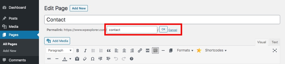 Как и в случае с постами, при создании новой страницы или редактировании старой вы можете найти поле slug прямо под заголовком. WordPress автоматически заполнит полное название страницы в качестве slug.