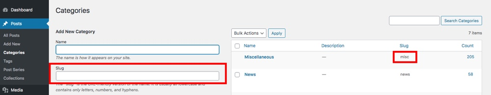 По умолчанию категории будут использовать “имя”, которое вы введете в качестве slug, или вы можете ввести собственный slug. В нашем примере выше вы можете видеть, что мы сократили slug категории “Разное” до “misc”. Но обычно ваши названия категорий изначально будут короткими и конкретными, и вам не придется (или не захочется) их менять.