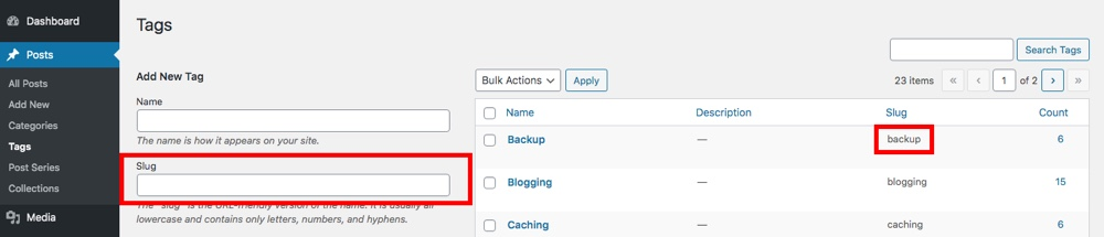 Теги работают так же, как и категории, и используют название тега в качестве slug. Вы, конечно, можете настроить это, но чаще всего в этом нет необходимости.