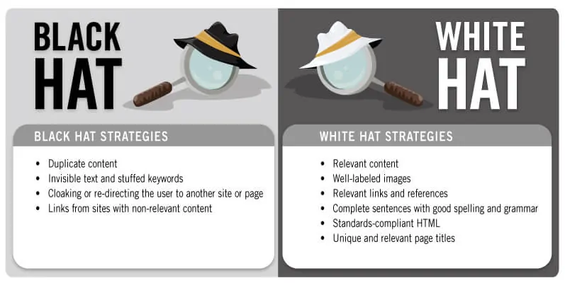 Если вы давно занимаетесь SEO, то, возможно, уже слышали о таких терминах, как “белая шляпа” SEO, “черная шляпа” SEO, “серая шляпа” SEO и т.д. Это все различные методы SEO, используемые для воздействия на поисковые рейтинги. Все они представляют собой различные техники SEO, используемые для влияния на рейтинг в поисковых системах. Поскольку наша тема посвящена методам белошляпного SEO, давайте поговорим только о них. Белошляпное SEO относится к тактикам, которые используются для получения лучших результатов поиска по различным ключевым словам. Методы белошляпного SEO безопасны, и все они подчиняются рекомендациям Google, в то время как черношляпное SEO включает в себя рискованные тактики, которые, скорее всего, приведут к тому, что ваш сайт будет наказан. В двух словах, стратегии “белой шляпы” SEO больше ориентированы на людей, чем на поисковые системы. Если вы хоть немного разбираетесь в SEO, вы, возможно, уже знаете, что Google поощряет те сайты, которые уделяют особое внимание удобству пользователей. Вот простая картинка, которая покажет вам разницу между “белошляпными” и “черношляпными” стратегиями SEO.