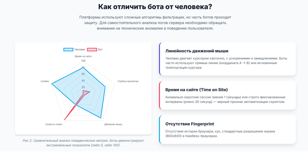 - Сложные боты (SIVT). Это главная угроза современности. Такие боты используют реальные браузеры в “безголовом” режиме (headless browsers), например, через инструменты автоматизации Selenium или Puppeteer. Они загружают весь контент страницы, выполняют скрипты метрик, могут имитировать движения мыши и даже прокрутку страницы.