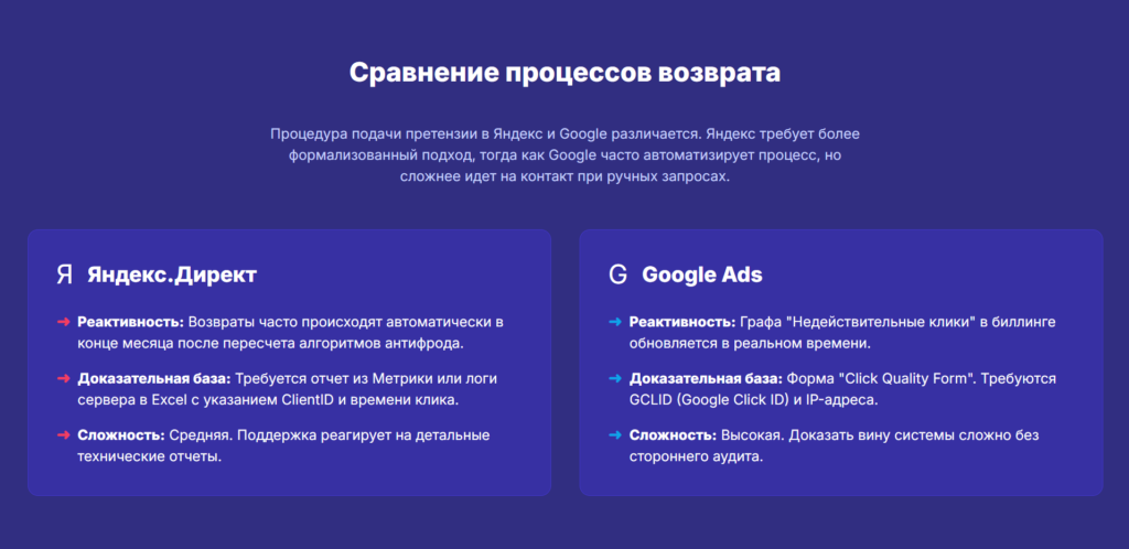 - Финансовые аспекты: Признание фрода означает для Яндекса уменьшение выручки. В спорных ситуациях (например, судебное дело ООО “Комфер” против ФАС и Яндекса, где рассматривались вопросы добросовестности рекламы) компания занимает жесткую оборонительную позицию.9 Добиться возврата через суд крайне сложно, поэтому упор нужно делать на досудебное урегулирование и технические доказательства.