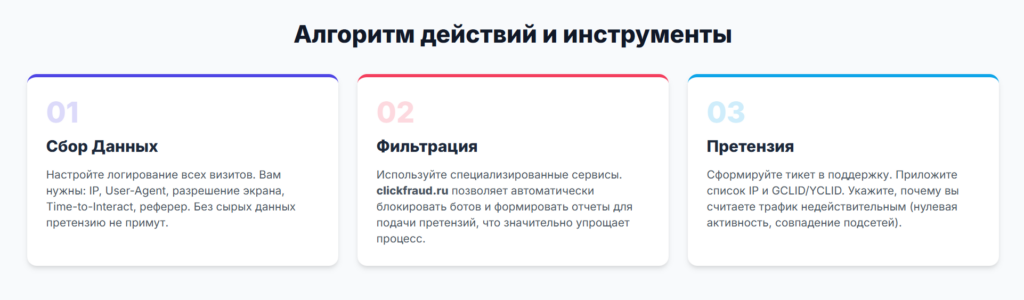 Если вы видите явные признаки атаки (резкий рост CTR, падение конверсии, странные визиты), а автоматических возвратов нет, необходимо инициировать расследование.