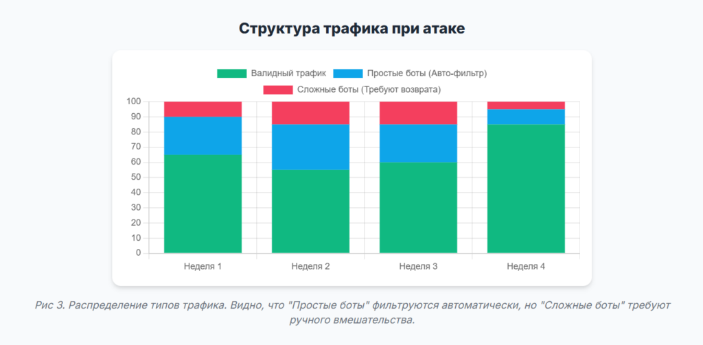 - Техническое обоснование: “Согласно анализу серверных логов (приложение 1), 45% кликов совершено с подсети IP 192.168.x.x с интервалом менее 200 мс. User-Agent данных запросов идентичен и устарел (Chrome 55). Показатель отказов (Bounce Rate) для этого сегмента составляет 100%, время на сайте — 0 секунд.”