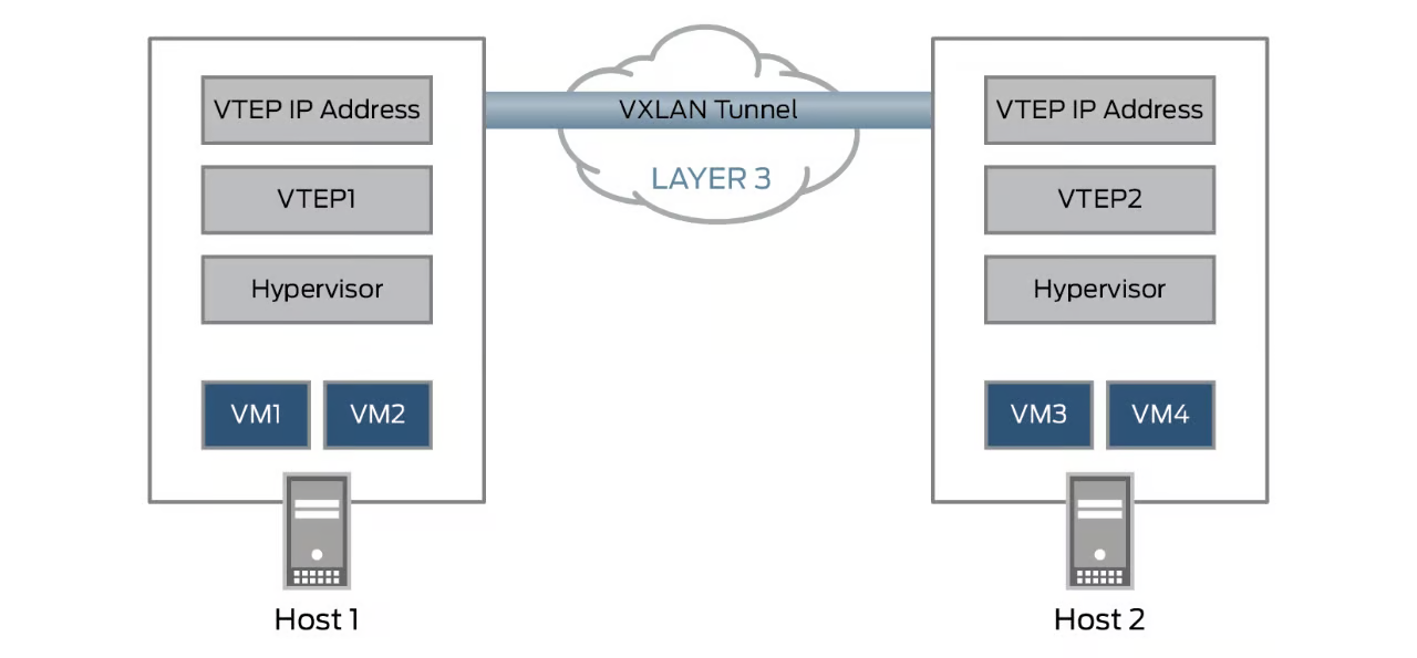 Давайте рассмотрим сценарий, чтобы понять, как работает эта VXLAN. Имеется 2 физических хоста. На хосте 1 находятся VM1 и VM2, а на хосте 2 – VM3 и VM4. Предположим, что хост 1 и хост 2 являются частью сети с поддержкой VXLAN, и VM1 хочет общаться с VM3.