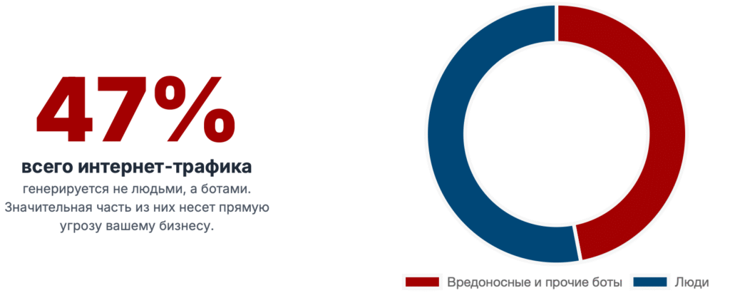 Более 47% всего интернет-трафика генерируется не людьми, а ботами.1 Значительная часть этих автоматизированных программ несет прямую угрозу вашему бизнесу, даже если вы этого не замечаете. Вредоносные боты искажают вашу веб-аналитику, скликивают рекламные бюджеты, воруют контент и цены, перегружают серверы и пытаются взломать аккаунты ваших клиентов.2 Последствия варьируются от неверных маркетинговых решений до прямых финансовых и репутационных потерь.4